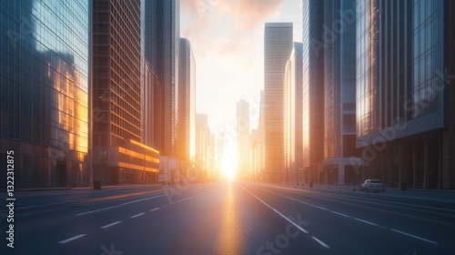 A wide, tranquil avenue framed by skyscrapers glows under the soft embrace of the morning sun, capturing urban serenity.