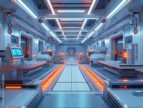 A wideangle view of a hightech assembly line with automated machines, Automation, Efficient and futuristic