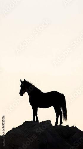 A wild horse standing majestically on a hilltop, silhouetted against a soft light solid color background