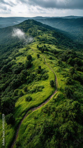 A winding dirt path meanders along a lush green mountain ridge with trees and vegetation under an overcast sky creating a scenic landscape view high above.
