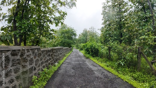 A winding path through lush green forest with trees on both sides, rain falling in the background.