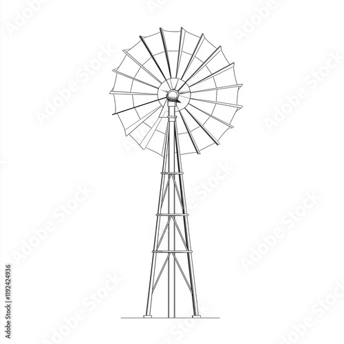 A windmill-powered irrigation system, renewable energy in agriculture, vintage sketch style, monochrome, isolated on white background