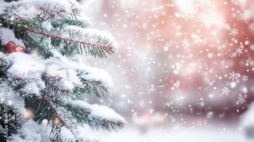 A winter background image showing snow falling on pine tree branches with blurred lights in the background