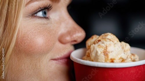 A woman eating a bowl of popcorn in a red cup