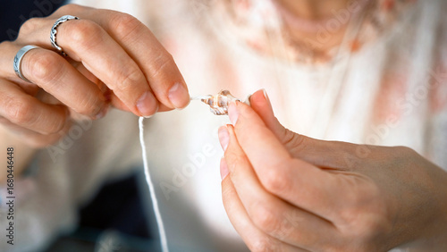 A woman holds a thread and a small shell in her hands, close-up. The needlewoman makes a necklace or bracelet. Master class, creativity and hobbies