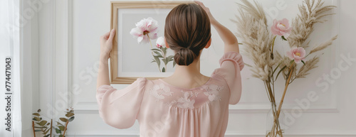 A woman in a pink dress is standing in front of a picture frame with a flower in it