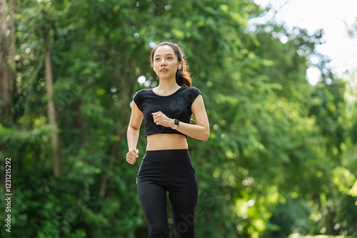 A woman in sportswear running in the park, enjoying fresh air, engaging in outdoor activities to maintain a healthy lifestyle, boosting cardiovascular health, and feeling happy and energetic