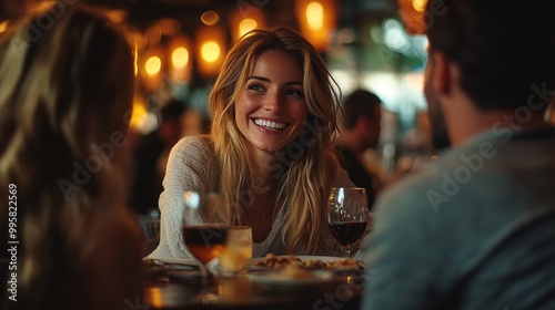 A woman is smiling at a man and another woman at a restaurant. The woman is holding a wine glass and the man is holding a wine glass as well. Scene is happy and friendly