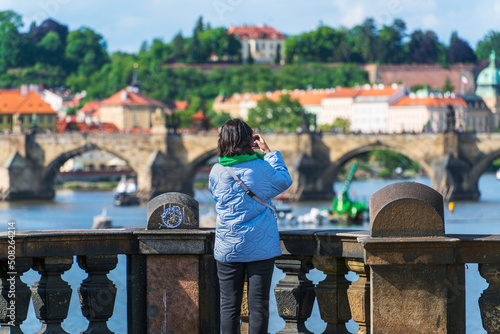 A woman near the stone railings of the bridge in Prague, Czech Republic, takes a view of the Vltava river and the old town on a smartphone on a sunny day, a tourist trip in Europe, back view