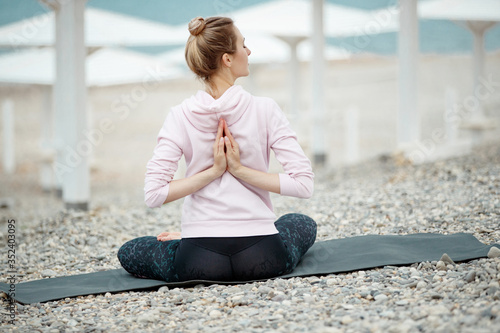 A woman practices yoga by the sea. Yoga girl. Young beautiful woman doing yoga poses in nature.