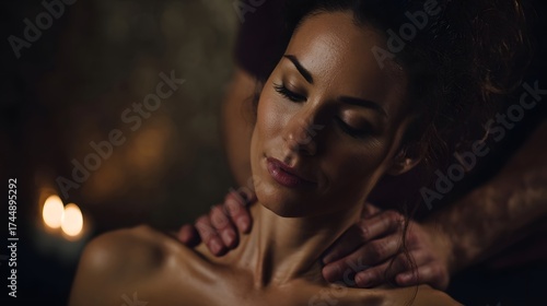 A woman receiving a relaxing neck and shoulder massage in a dimly lit candlelit room