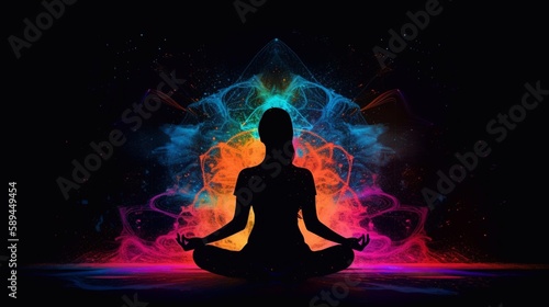 A woman sitting in the lotus pose in yoga and her connection to the universe. Generative AI.
