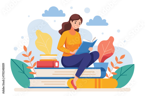 A woman sitting on a stack of books, symbolizing online learning and education, woman sitting on a book with online learning concept, Simple and minimalist flat Vector Illustration