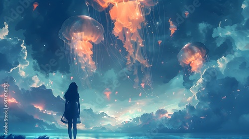 A woman stands by a serene body of water, gazing at ethereal, glowing jellyfish floating in a surreal, cloudy sky.