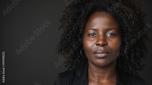 A woman stands poised with curly hair and a subtle expression, highlighting her confidence. The dark background emphasizes her features and presence