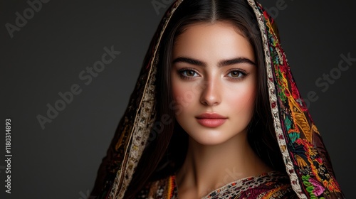 A woman wearing a colorful scarf and a long dress