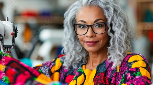 A woman wearing glasses sitting in front of a sewing machine