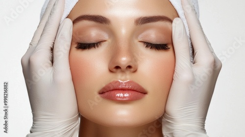 A woman wearing gloves is getting her face done