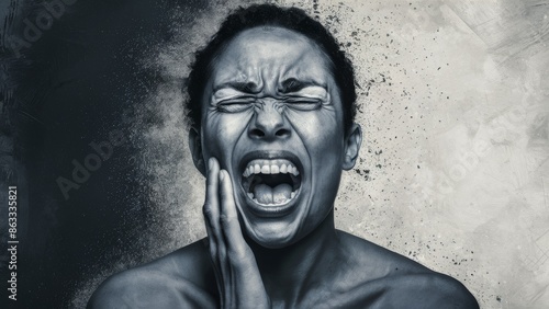 A woman with a black shirt and no teeth is holding her mouth, AI
