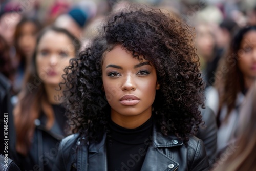 A woman with curly hair wearing a leather jacket, perfect for various editorial and commercial uses