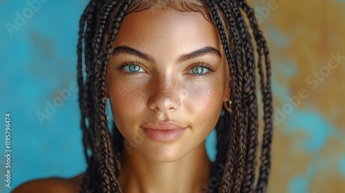 A woman with dark hair and a blue eye is smiling. She has a tan complexion and is wearing gold earrings