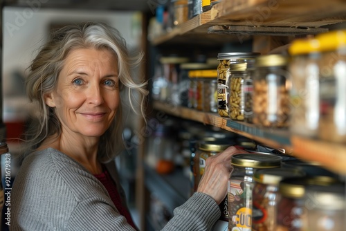 A woman with grey hair smiles as she reaches for a jar of preserved goods from a shelf in a pantry.