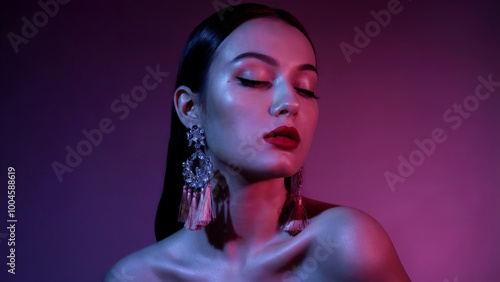 A woman with her eyes closed, set against a gradient of purple and pink hues. She has a prominent red lipstick and her skin appears to be illuminated with a soft glow.