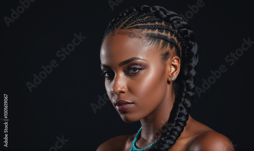 A woman with long, black braids looks directly at the camera