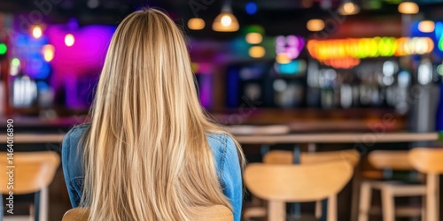 A woman with long blonde hair sits in a bar. The bar is dimly lit and has neon lights. The woman is looking at the camera