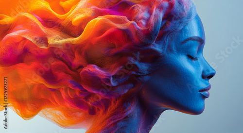 A woman with long, colorful hair is shown in a blue and orange color scheme. The hair is styled in a way that it looks like it is on fire, giving the impression of a fiery, energetic
