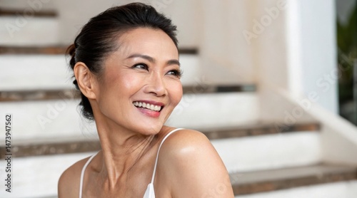 A woman with short dark hair smiles brightly while looking away, seated on white stairs in a softly lit setting.