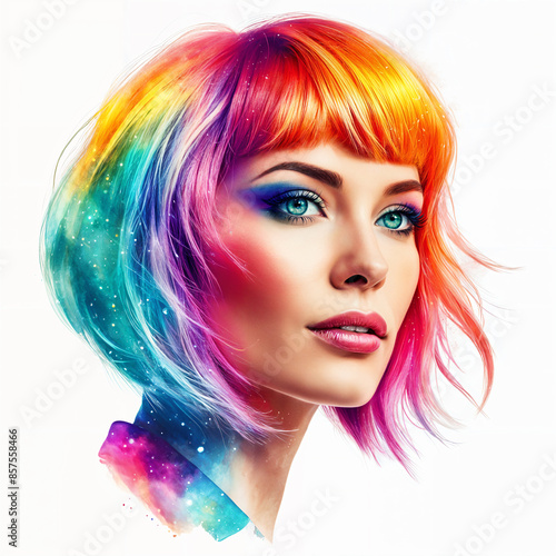A woman with vibrant, colorful hair and makeup, set against a white background.