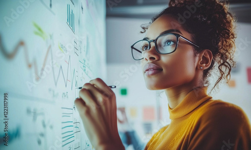 A woman writes on a glass board, deep in thought, showcasing creativity and focus in a professional setting.