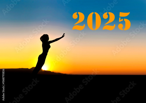 A woman's jump to the year 2025 against the backdrop of sunset. New Year 2025