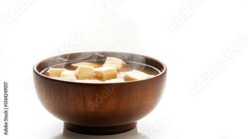 A Wooden Bowl Filled With Steaming Soup And Tofu Cubes