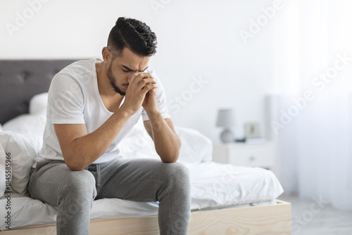 A young Arab man sits on his bed at home, visibly upset. He is burying his head in his hands, showing signs of distress and despair. The room is bright and simple, amplifying his feelings.