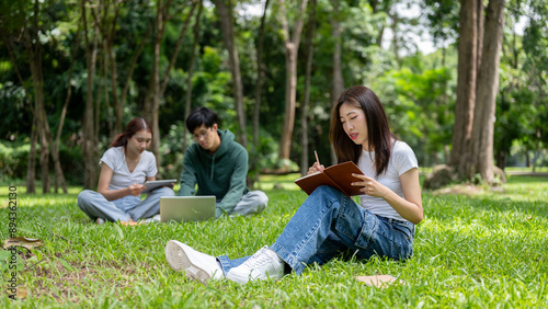 A young Asian female college student is doing homework or writing her diary in the campus park.