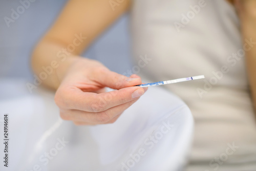 A young attractive woman holds a pregnancy test in her hand. The girl is shocked by the positive result of the pregnancy test. Unwanted pregnancy