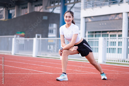 A young beautiful Asian woman in sports outfits doing stretching before workout outdoor in the park in the morning to get a healthy lifestyle. Healthy young woman warming up outdoors