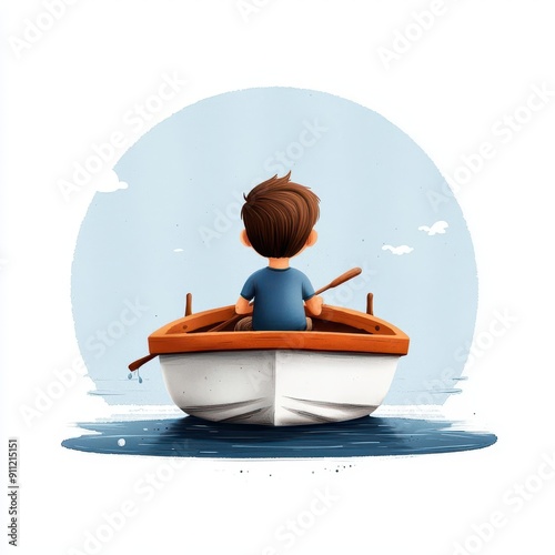 A young boy rows a small boat on a calm lake, looking out at the horizon.