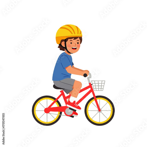 A young boy with a helmet rides a red bicycle with a basket on a white background