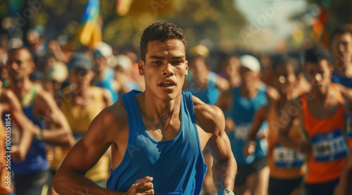 A young Brazilian male athlete runs a marathon, looking determined and focused as he approaches the finish line, showcasing endurance and dedication.