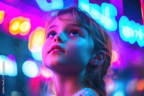 A young child stands in front of a colorful neon sign, ideal for use in advertising, commercial or personal projects
