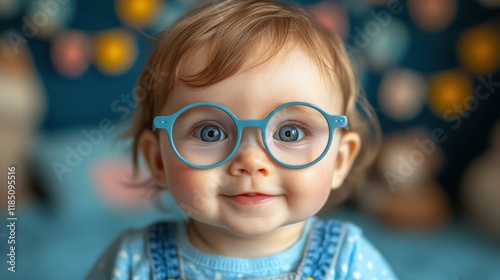 A young child wearing blue glasses and a blue shirt is smiling. The child's eyes are wide open, and they are looking directly at the camera