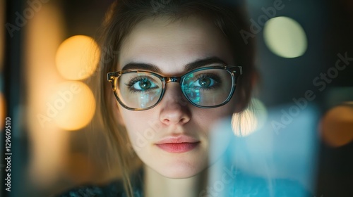 A young, confident businesswoman, her eyes twinkling behind her elegant glasses, navigated the digital landscape of her modern workplace, a vibrant office space where the glow of her laptop screen