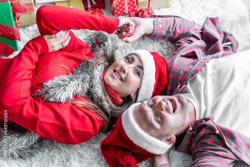A young couple is celebrating their Christmas together happily at home.
