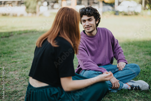 A young couple sits on the grass, enjoying a sunny outdoor day. They are engaged in conversation and appear relaxed and happy, surrounded by a park setting.