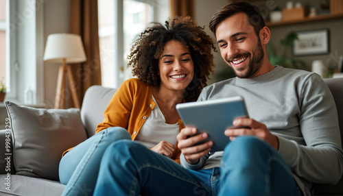 A young couple sitting on a couch, smiling while looking at a tablet, relaxed and enjoying their time together.