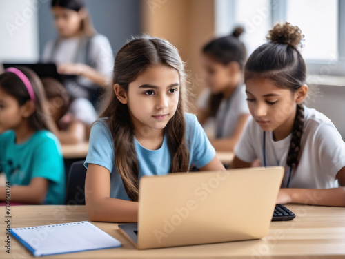A young girl, immersed in a coding lesson, hones her tech skills while seated with a laptop.