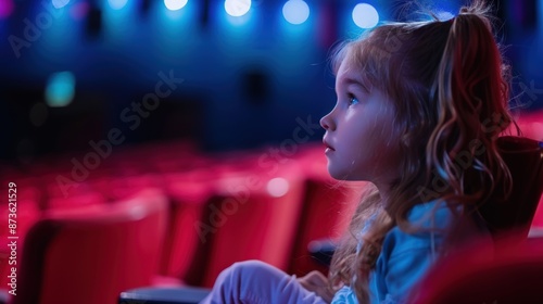A young girl intently watching a movie in a dimly lit theater, surrounded by empty red seats and colorful lights.